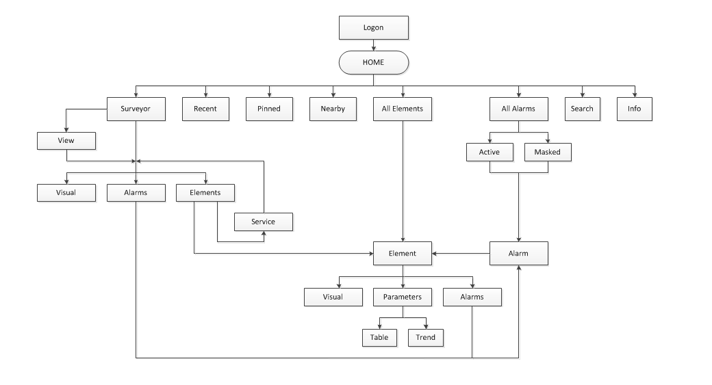 The principle behind these displays is that the system can be monitored at a high level and errors will ‘bubble up’ to the higher levels. The hierarchy allows the Operator to drill down in a logical way to the source of the problem so that the detailed information can be used to diagnose any problems.