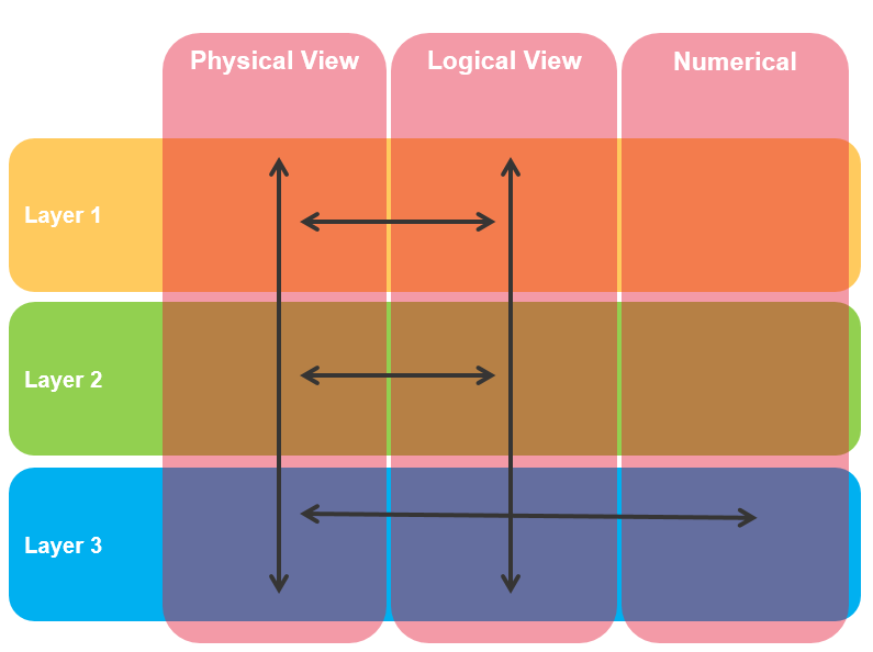 The one web project will be divided into three types of views. The physical view, the logical view and the numerical view; the system was divided in order to show different aspects of the system on different views. Each component of the system will have a physical and logical view, whereas some components will include also a numerical view. This separation will help the user identify specific information and navigate the system faster and more efficient. The figure below shows specifically how the system is going to be separated and the arrows represent the possibilities of navigating through the system.